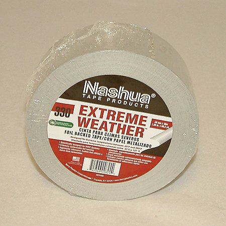Nashua 330X Extreme Weather Foil Tape is an all-weather aluminum foil tape with acrylic pressure sensitive adhesive. It is used to tape joints and seams in duct work for heating, air conditioning, and refrigeration systems. Specifically intended for use over a wide temperature range. Suitable for general repairs and a variety of insulation uses. Nashua 330X has a special adhesive system which has aggressive adhesion even at -25DF. Its aluminum foil backing is extremely conformable and its adhesive is quick stick. the tape matches most laminated duct work. Low VOC (Volatile Organic Compounds) - complies with VOC requirements of SCAQMD Rule 1168. Widths shown in dropdown are in inches. NOTES: Sizes shipped will typically be the tape industry standard metric-cut sizes, i.e. 24mm for each 1 inch of nominal tape width ordered (rolls are approximately 5% narrower than the nominal size). This product's actual size is 48mm x 46m.