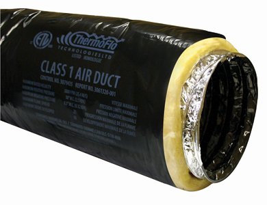 ThermoFlo Technologies 'SRB' series is an industrial quality insualted duct manufactured "tough" for consumers' and installers' peace of mind. It consists of a three ply polyester laminate, fiberglass reinforced scrim, galvanized spring steel wire, wrapped with fiberglass insulation, which provides an outstanding combination of strength and tear resistance. A heavy duty fire retardant black polyethylene vapor barrier adds extra durability. The insulation reduces heat loss & condensation.